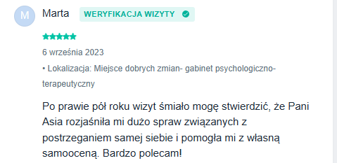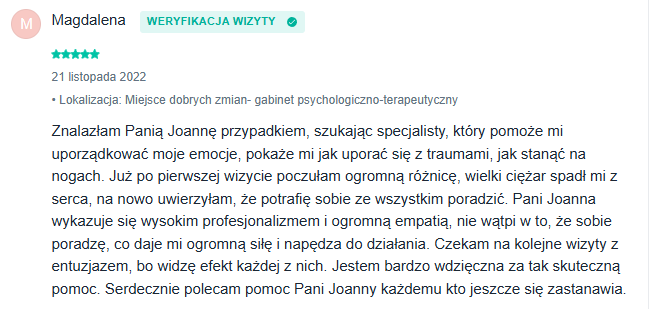 Uwielbiam pracować z Kobietami i obserwować ich rozwój. Każda z kobiet, z którymi pracowałam, zyskała siłę, by zakończyć niszczącą relację, i wszystkie zgodnie twierdzą, że była to jedna z najlepszych decyzji w ich życiu.